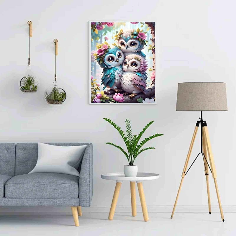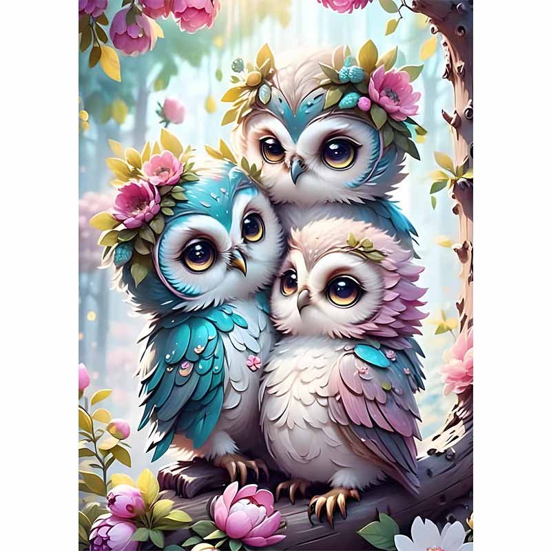 Diamond Painting-Eulenfamilie im Blumengarten